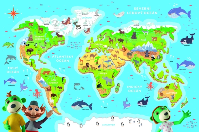 Educatieve puzzel voor kinderen met een wereldkaart en dieren, die kinderen op een leuke manier aardrijkskunde leert. Bevat beschrijvingen in het Tsjechisch.