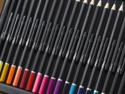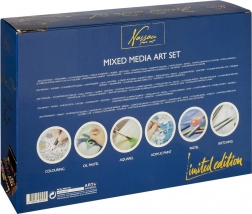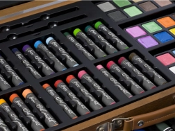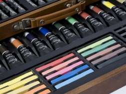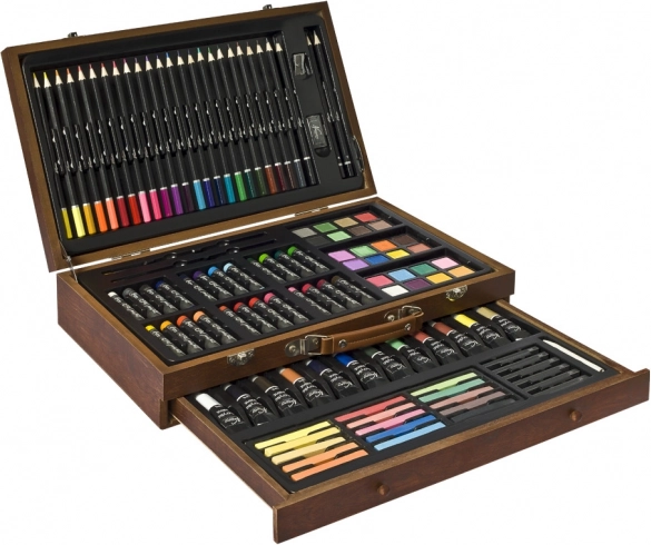 Schilderset in houten koffertje – het houten uitklapbare koffertje bevat alles voor de schilder – waskrijtjes, kleurpotloden, verf, puntenslijper, gum, penselen enz. in totaal 112 stuks.