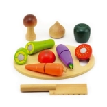 Set voor het snijden van groenten voor kinderen bevat 16 houten onderdelen die ideaal zijn voor de ontwikkeling van motorische vaardigheden. De afzonderlijke stukken fruit zijn verbonden met klittenband.