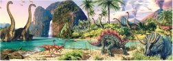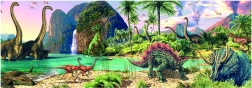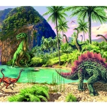 Deze puzzel bestaat uit 150 stukjes die samen een fascinerend tafereel vormen vol dinosaurussen in een tropische omgeving, waar kinderen leren over de wereld van vroeger.