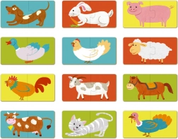 Set van eenvoudige puzzels met twee stukjes, bedoeld voor kinderen die net met puzzels beginnen. Grote en stevige stukjes met een dikte van circa 3 mm maken het leggen makkelijker. Afmeting van een stukje: 6,5 × 5,5 cm. Leeftijd: 18m+.
