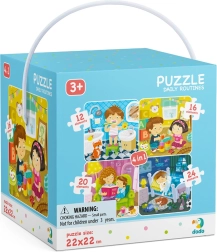 Kinderpuzzel van het merk DODO met afbeeldingen van dagelijkse activiteiten. Afmeting van de puzzel na het leggen: 22×22 cm. Leeftijd: 3+