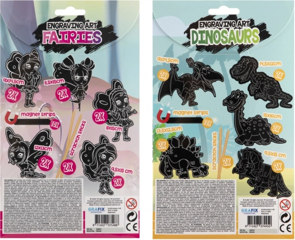 Ontdek een creatieve set voor kinderen en volwassenen: krasmagneten met motieven van feeën en dinosaurussen. In de verpakking vind je 10 magneten en 2 kraspennetjes voor eenvoudig knutselen. Bevestig de afgewerkte magneten op elk metalen oppervlak – koelkast, magneetbord of kastje.