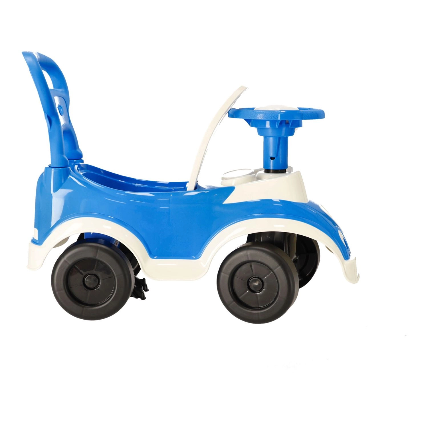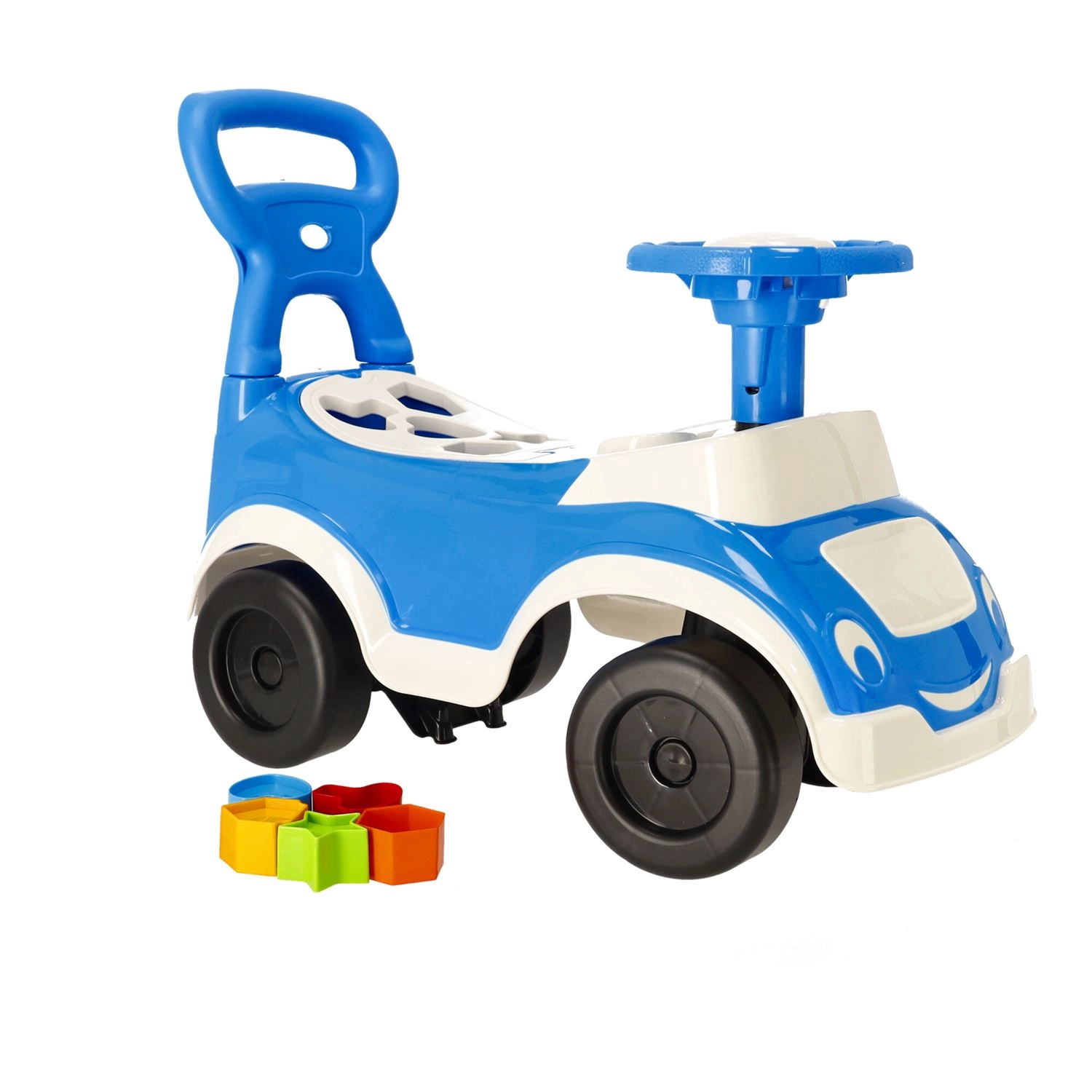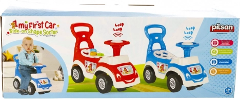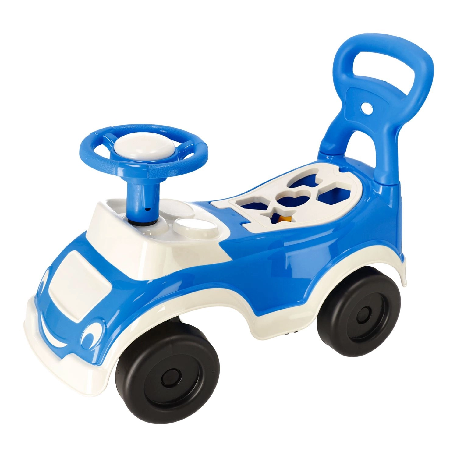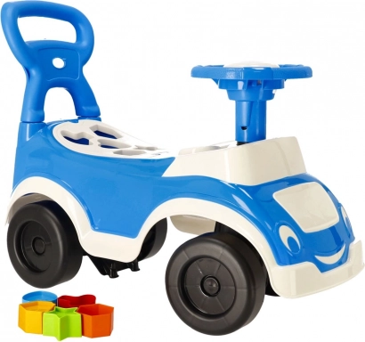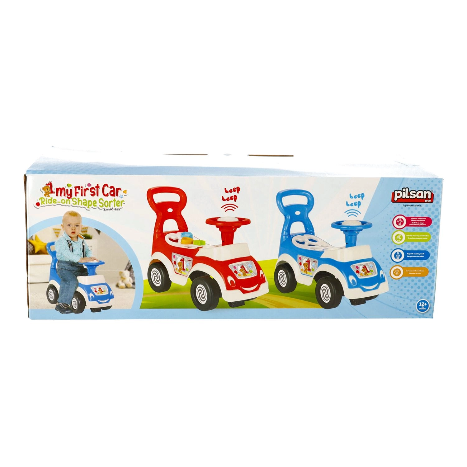 Praktische 4-in-1 loopauto van Pilsan in blauwe kleur, combineert rijden, duwen, looptrainer en educatieve vormensorteerder. Biedt een veilige rugleuning die afneembaar is, een mechanische claxon, opbergruimte onder de zitting en hoogwaardige, kindvriendelijke materialen. Stimuleert motoriek, balans en coördinatie van kinderen, voor plezierig rijden binnen en buiten.