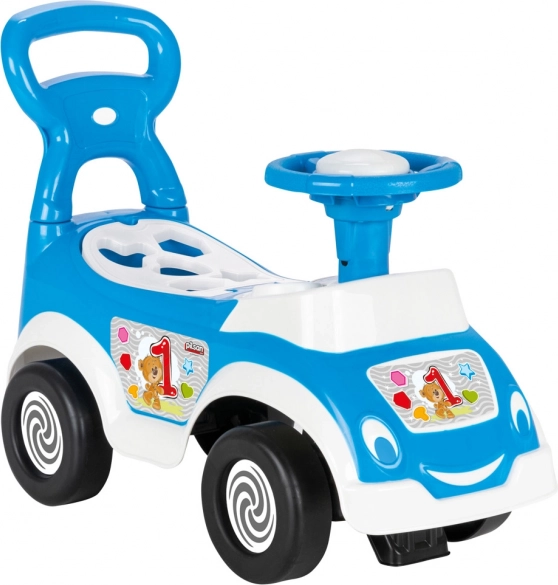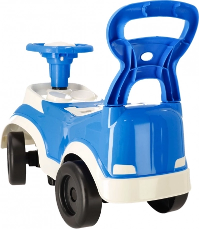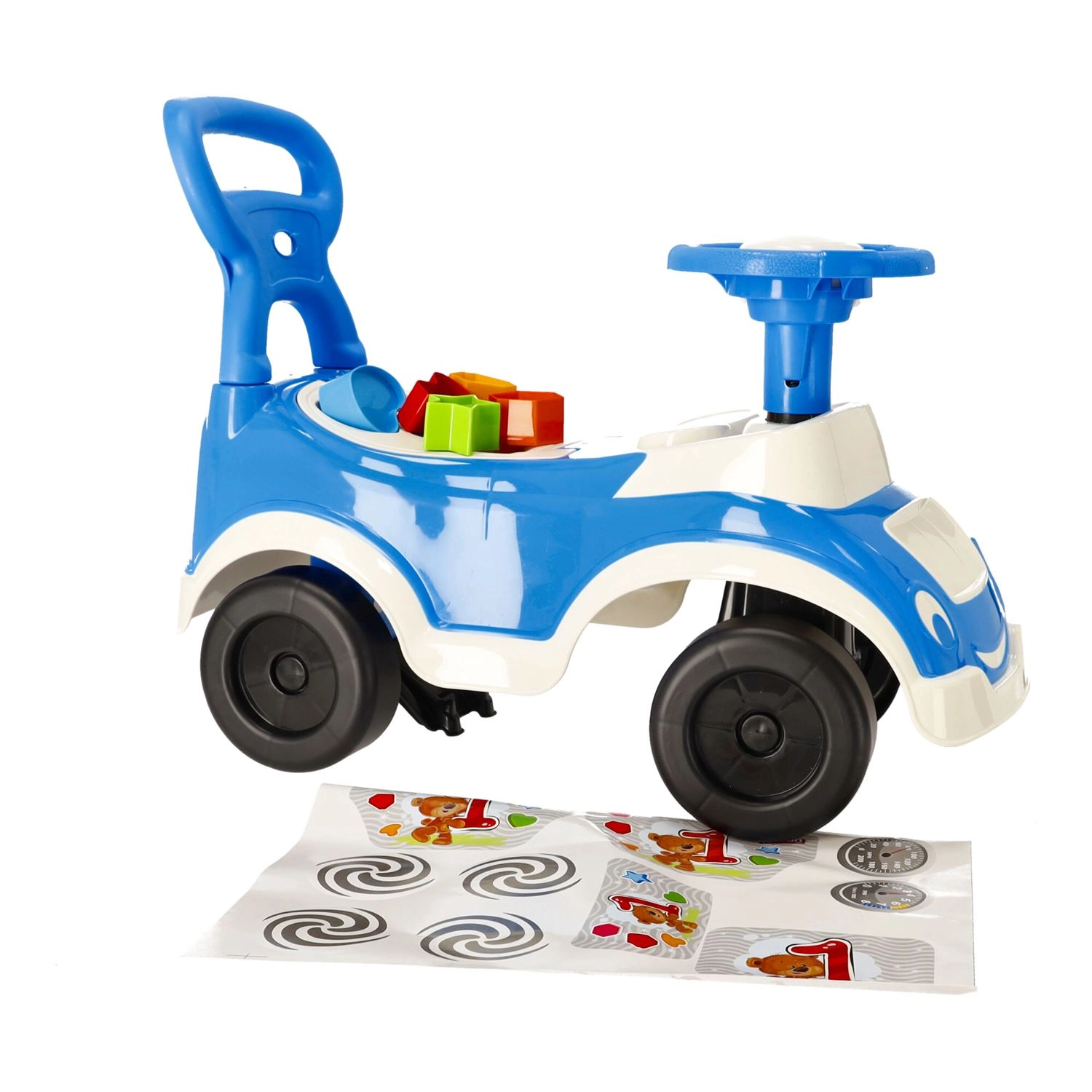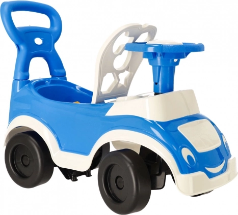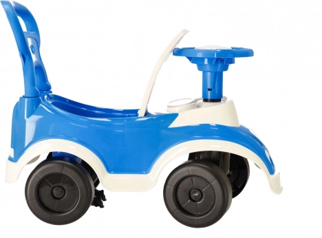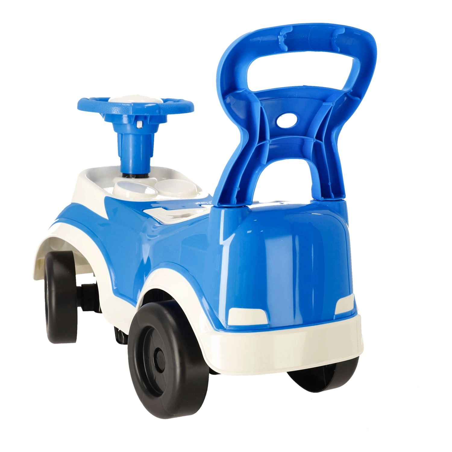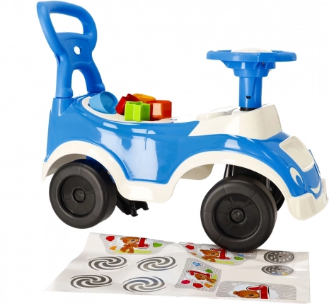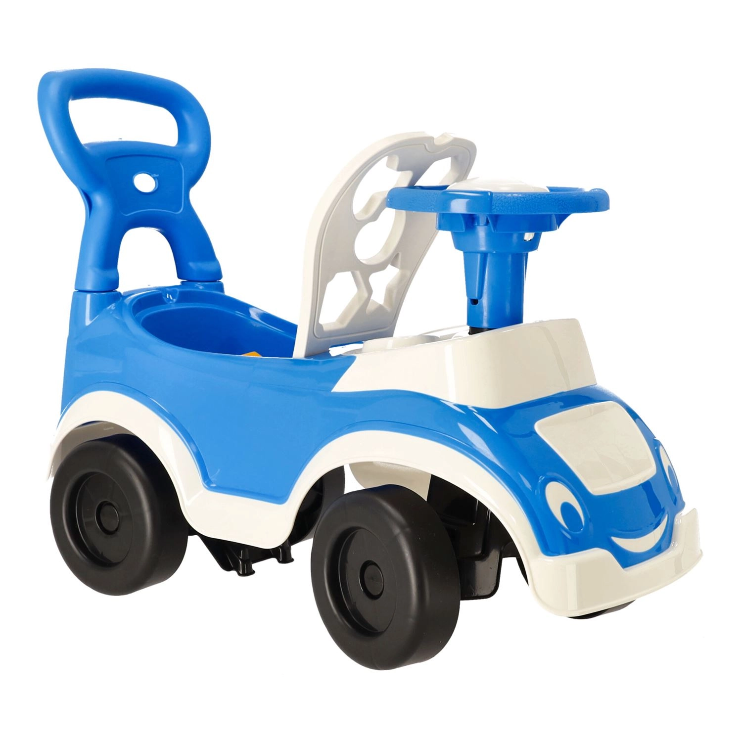 Praktische 4-in-1 loopauto van Pilsan in blauwe kleur, combineert rijden, duwen, looptrainer en educatieve vormensorteerder. Biedt een veilige rugleuning die afneembaar is, een mechanische claxon, opbergruimte onder de zitting en hoogwaardige, kindvriendelijke materialen. Stimuleert motoriek, balans en coördinatie van kinderen, voor plezierig rijden binnen en buiten.