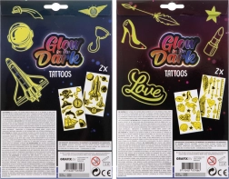 Deze set lichtgevende tatoeages is ideaal voor meisjes die hun stijl wat sprankeling willen geven. Geniet van de verschillende motieven die in de verpakking zitten, met twee vellen tatoeages. Knip eenvoudigweg uit, breng aan op de huid, maak vochtig met een spons en klaar! Het gebruik is snel en leuk.