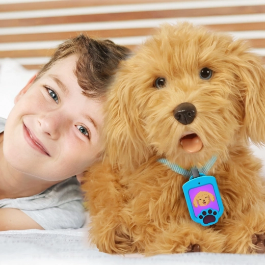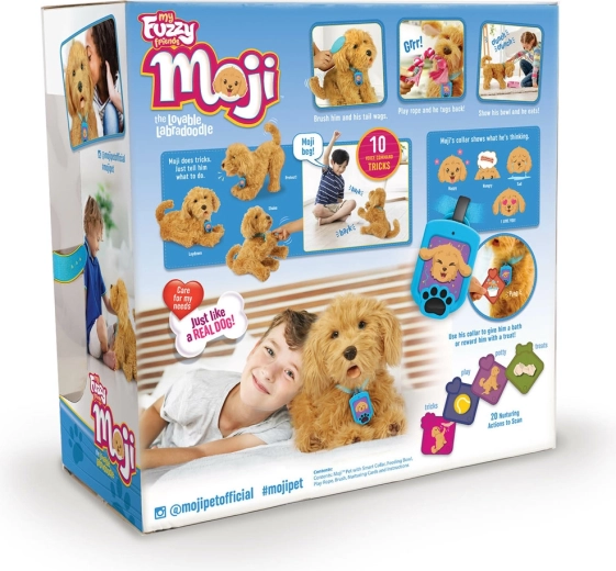 Moji is een knuffelige interactieve hond met een zachte vacht en een schattige blik die al snel de harten van kinderen verovert. Dankzij geavanceerde sensoren en de slimme halsband met display reageert hij realistisch op zijn omgeving, leert hij commando’s en communiceert hij zijn behoeften en stemming.