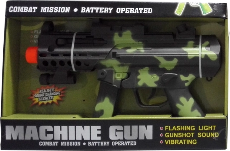 Speelgoedmitrailleur met licht en geluid. Stimuleert verbeelding, coördinatie en creativiteit. Werkt op 3× AA (niet inbegrepen). Geschikt vanaf 3 jaar.
