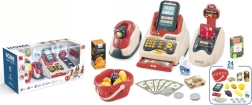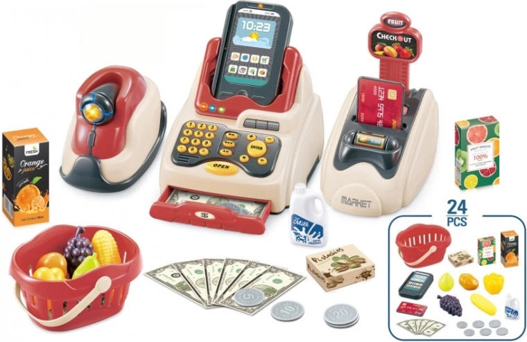 De set bevat alles wat een kleine winkelier nodig heeft: een kassa met knopjes, een kaartenlezer, een betaalterminal voor contactloos betalen, een winkelmandje, speelgeld en een gevarieerde selectie boodschappen om “te kopen”. Ideaal voor rollenspel, en voor de ontwikkeling van communicatie en samenwerking met vriendjes.