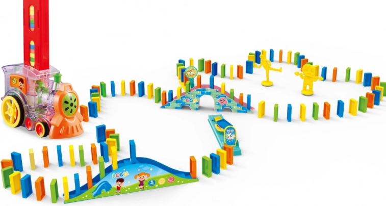 Een leuk treintje met domino voor kinderen vanaf 3 jaar zorgt voor uren creatief speelplezier. Het rijdende treintje zet automatisch dominostenen neer terwijl kinderen hun spectaculaire val volgen. Ondersteunt fijne motoriek, creativiteit, concentratie en logisch denken. Werkt op 2× AA-batterijen (niet inbegrepen).