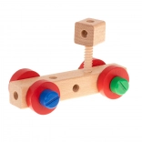 constructiedelen, schroeven en moeren, houten schroevendraaier en sleutel