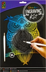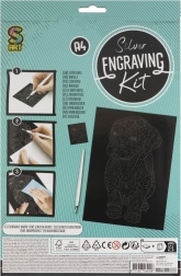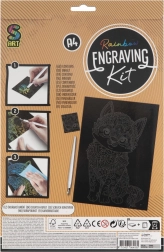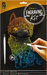 Maak je eigen originele kunstwerk met een kattenmotief – kras zachtjes de voorbedrukte lijnen weg en onder de zwarte deklaag verschijnen regenboogkleuren. Laat je fantasie de vrije loop: je kunt ook de vrije zwarte vlakken inkleuren en je eigen kader of details creëren.