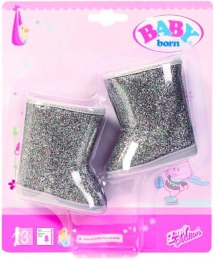 Zilveren glinsterende BABY BORN enkellaarsjes voor poppen van 43 cm. Duurzaam, eenvoudig aan te trekken, ideaal vanaf 3 jaar. Stijlvolle accessoire voor creatief spel.