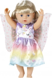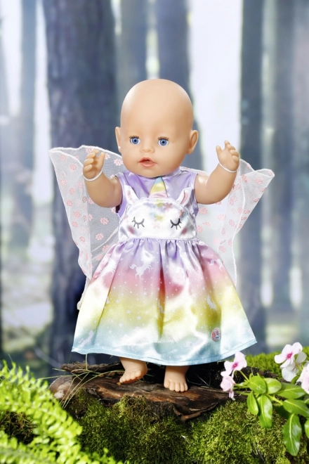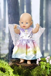 Feeën en eenhoorns horen bij elkaar als melk en koekjes. Het feeënjurkje voor de BABY born-pop is gemaakt van een prachtige regenboogstof. Het rokje is bedrukt met magische eenhoorns die dansen aan de sterrenhemel. Het bovendeel van het jurkje is vooraan versierd met het gezicht van een eenhoorn met opgenaaide oortjes en een kleurrijke hoorn. Een echte fee moet natuurlijk ook vleugeltjes hebben. De transparante vleugeltjes met glinsterende bloemetjes zijn in het achterpand van het jurkje ingezet en zodra BABY born haar arm door het kleine lusje in het bovenste deel van de vleugeltjes steekt, gaan ze open. Originele outfit voor BABY born-poppen. Voor fantasierijk, gevarieerd en langdurig speelplezier. BABY born Sprookjeskostuum Eenhoorn voor poppen van 43 cm. Kledinghanger inbegrepen.