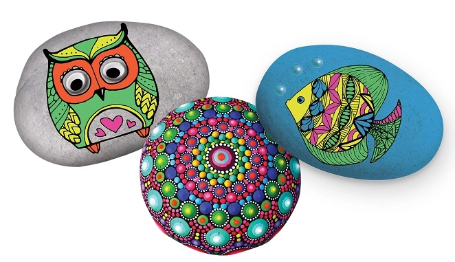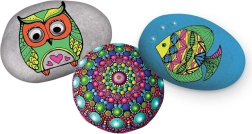 Vier zorgvuldig geselecteerde stenen zijn ideaal om te beschilderen. Met het penseel en de houten prikstok maak je lijnen, stippen en mandalapatronen.