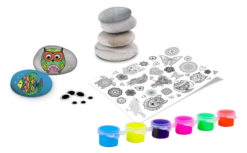 4 stenen, 6 neonverven, 1 penseel, 1 houten prikstok, 1 vel transferstickers, zakje met zelfklevende oogjes en kraaltjes