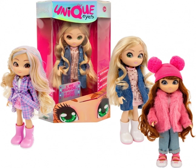 De Unique Eyes-pop verrukt kleine liefhebbers van mode en fantasie. Haar grote, betoverende ogen geven haar een unieke uitstraling, terwijl de lange haren uitnodigen om te kammen en kapsels te maken. De modieuze outfit en schoenen geven elk spel een extra touch.