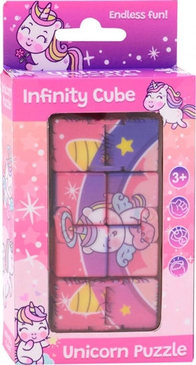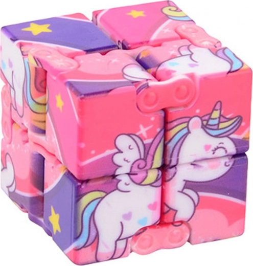 Roze opvouwbare antistresskubus met eenhoornthema. Om te klappen in verschillende vormen, plezier en rust voor handen en geest. Verpakking 1 stuk, mix motieven.