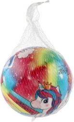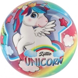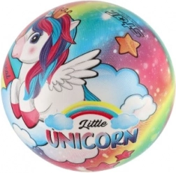 De bal is versierd met een eenhoorn thema met regenbogen, sterren en wolken, wat het visueel aantrekkelijk maakt voor kinderen.