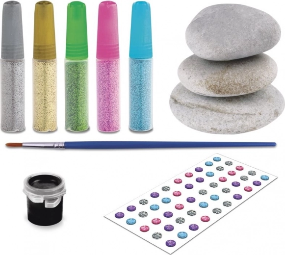 Drie natuurlijke gladde stenen, een penseel, zwarte verf, vijf metallic tinten en glinsterende steentjes – begin meteen met creëren na het uitpakken.