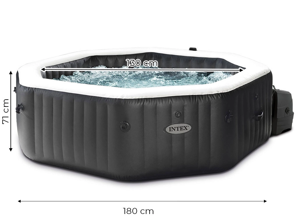 De INTEX opblaasbare spa in elegante zwarte kleur verandert je terras, tuin of interieur in een privéspa. De binnendiameter van 150 cm biedt comfortabel plaats aan maximaal 4 personen, terwijl 120 bubbels spierspanning verminderen en elke avond veraangenamen. Dankzij de snelle verwarming tot 40 °C geniet je zonder onnodig wachten van een warm bad.