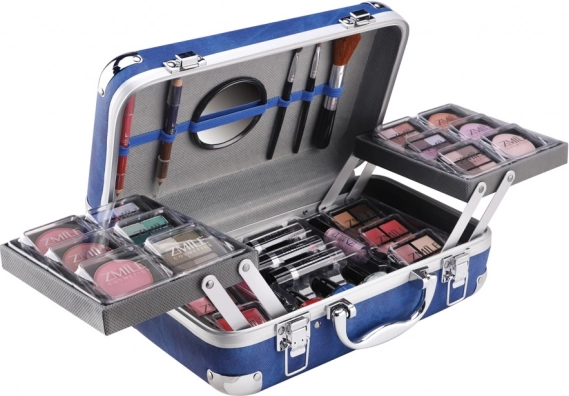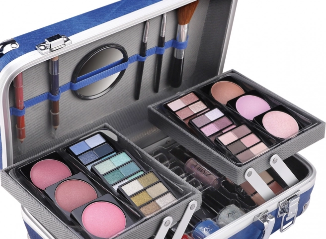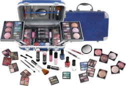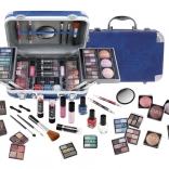 Cosmetische koffer met aluminium hoeken van Travel Blue met geïntegreerde spiegel – in totaal 84 stuks accessoires.