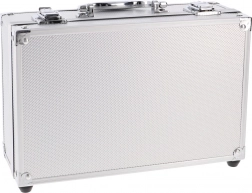 De zilverkleurige koffer met sluitingen en stevig handvat beschermt je cosmetica en maakt meenemen thuis en onderweg eenvoudig.