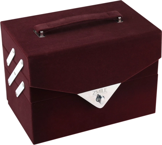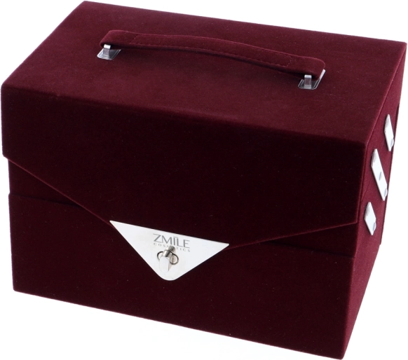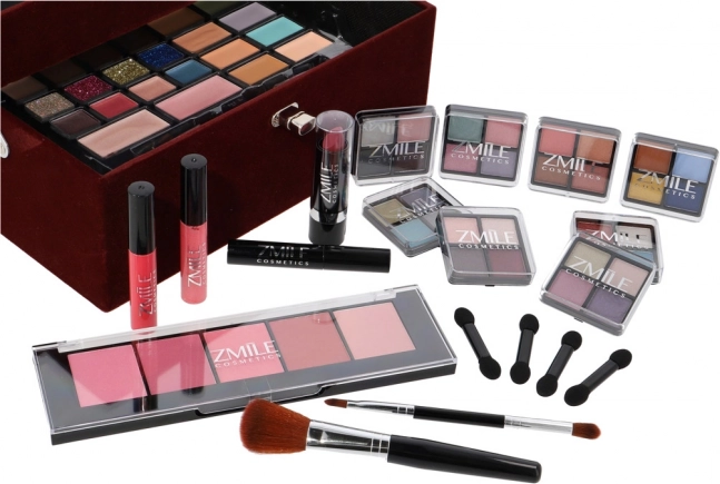 Sametachtige cosmetische koffer Beauty Case Velvety – donker bordeauxrood fluweel – in totaal 74 stuks accessoires. Bevat 32× oogschaduws in 4 compacte palettes, 5× blush, 3× wenkbrauwpoeders, 1× wenkbrauwwax, 4× crèmige oogschaduws, 4× glittercrèmes, 2× oogschaduwprimers, 8× concealer, 2× lipgloss, 1× lipstick, 1× mascara, 1× dubbelzijdig oogpotlood, 1× dubbelzijdig lippotlood, 1× blushkwast, 1× dubbelzijdige oogschaduwkwast, 4× dubbelzijdige applicator, 1× geïntegreerde spiegel. Dermatologisch getest, voldoet aan strenge EU-normen.
