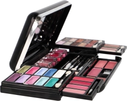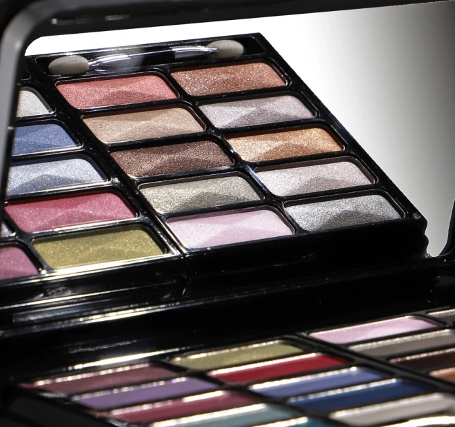 - Complete uitrusting in één: oogschaduws, blushes, glosses, poeders, potlood, tools.