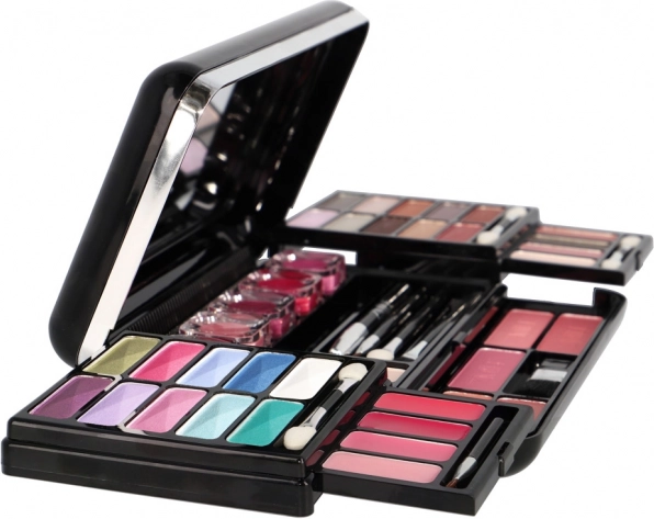 Het elegante zwarte etui met spiegel bevat een complete set voor het opmaken van ogen, wangen en lippen – ideaal voor op reis en dagelijks gebruik.