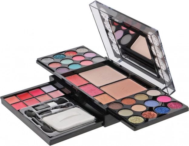 - 16× oogschaduw, 8× crèmige lipgloss, 8× glittercrème, 2× poeder, 1× applicator/kwast (3-in-1), geïntegreerde spiegel