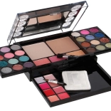 Complete set voor ogen, lippen en teint in een elegante zwarte palet met spiegel en applicators – ideaal voor thuis en onderweg.