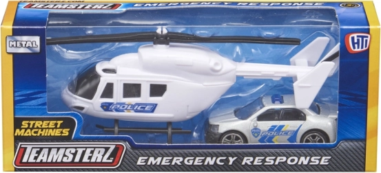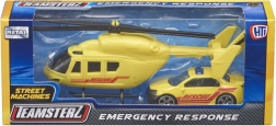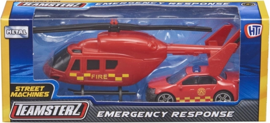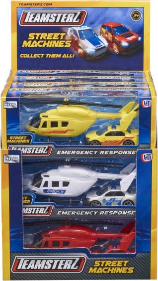 De TEAMSTERZ-set combineert plezier en duurzaamheid: een gedetailleerde helikopter met handmatig draaibare bladen en een actie-interventiewagen met vrijlopende wielen. Dankzij het metalen (drukgegoten) frame en hoogwaardige kunststof onderdelen genieten kinderen van realistisch spel als politie, brandweer en redding.