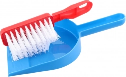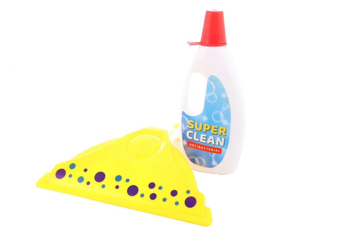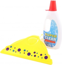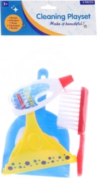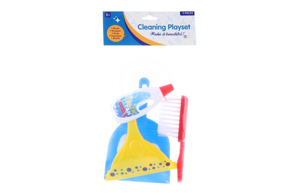 Schoonmaakset voor kleine huisvrouwen bevat – een stofpan, handveger, raamtrekker, sponzen en schoonmaakmiddel.