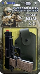 Politiepistool Command is het perfecte speelgoed voor kleine wetshandhavers. Dit metalen acht-schots pistool biedt een realistisch uiterlijk en wordt geleverd met een leren holster voor gemakkelijk dragen.