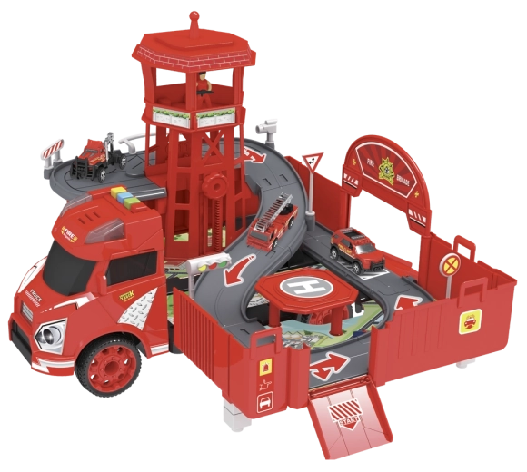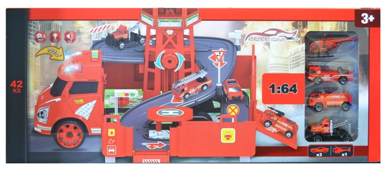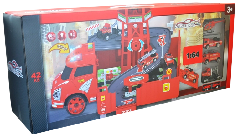 Brandweerkazerne- en garage-set met accessoires (set). Afmetingen van de garage na uitklappen: 46,5 × 49 × 29 cm. Knoppen voor geluids- en lichteffecten, vrijloopfunctie, functie "PROBEER MIJ". Activeren van de PROBEER MIJ-functie: verwijder de beveiligingsstrip uit het batterijvak, te vinden op de cabine van de auto, en test de functies door op de knoppen op het dak van de cabine te drukken. Inhoud van de set: brandweerauto/garage 2-in-1 (functie om te veranderen van auto naar garage en terug), metalen modelautootjes 1:64 (6 stuks) en een helikopter.