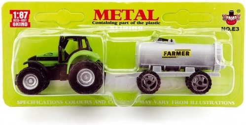 Model van een tractor met grote zwarte wielen en een grijze tanker, gemarkeerd als 'FARMER'.