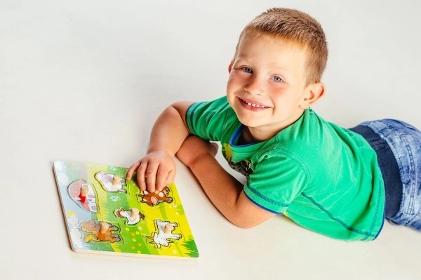 Elk puzzelstukje is voorzien van een klein houten handvat, waardoor kinderen eenvoudig het grijpen en plaatsen van stukjes op de juiste plek kunnen oefenen.