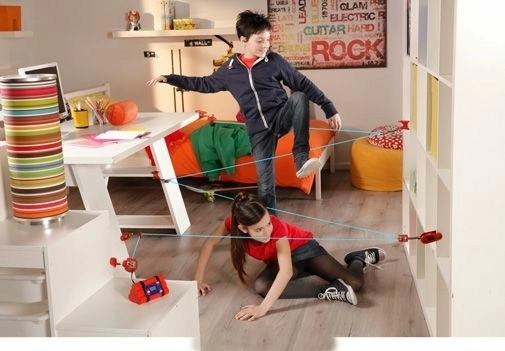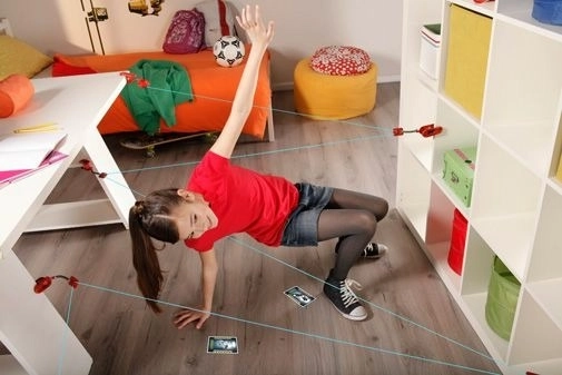 Rode units en klemmen vormen een netwerk van blauwe “lasers”. Kinderen oefenen behendigheid en coördinatie terwijl ze plezier hebben in een veilige thuisomgeving.