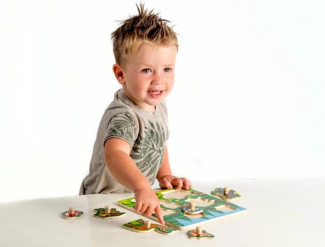 Elk puzzelstukje heeft een praktische knop, zodat kinderen het comfortabel kunnen vastpakken en veilig in de juiste uitsparing kunnen plaatsen.