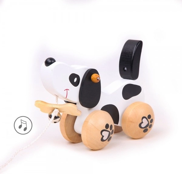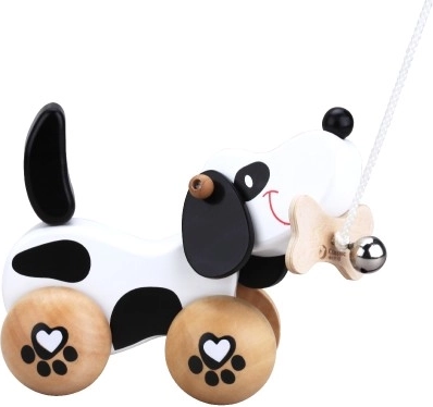 De hond heeft wieltjes met pootafdrukken en zijn staart wiebelt tijdens het bewegen, wat bijdraagt aan zijn speelsheid. Het plezier wordt vergroot door het belletje, dat het gehoor van kinderen stimuleert. Het is uitgerust met een touwtje dat aan een bot in zijn bek is bevestigd, wat gemakkelijk trekken mogelijk maakt. Het speelgoed is geschikt voor zowel binnen als buiten spelen.