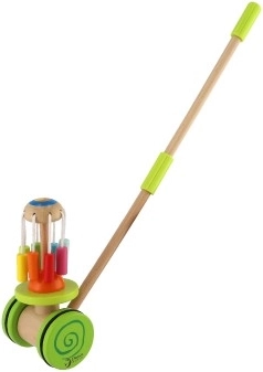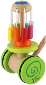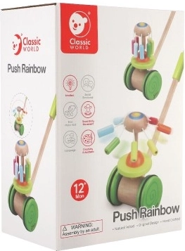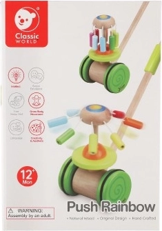 De houten kleurrijke duwwagen Classic World is het ideale speelgoed voor kleine ontdekkers die leren lopen. Deze wagen is uitgerust met een kleurrijke carrousel die draait en prettige geluiden maakt, wat de aandacht van kinderen trekt en hun loopontwikkeling ondersteunt.