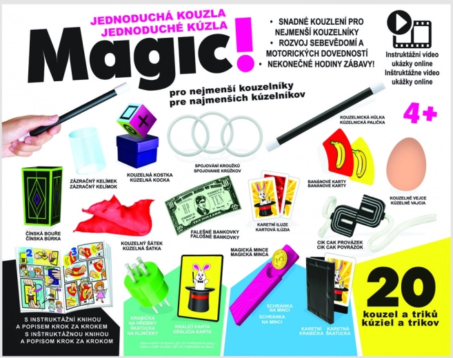 SUPEREENVOUDIGE magie, set van 20 trucs. Met deze luxueuze verzameling magische rekwisieten en met behulp van enkele alledaagse voorwerpen kun je 20 ongelooflijke magieën, trucs en illusies uitvoeren. Bevat de duidelijkste stap-voor-stap instructies en zelfs de jongste goochelaars kunnen snel hun vaardigheden ontwikkelen. Word meester en artiest van de ‘magie’! Leeftijd 4+, handleiding met afbeeldingen + online handleiding