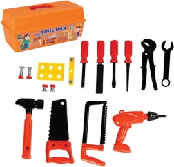 - Set van 34 delen: boormachine, schroevendraaier, zaag, sleutel, hamer, tang en diverse verbindingsstukken.