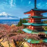 Een pagode te midden van bloeiende kersenbomen met de berg FUJI op de achtergrond brengt harmonie tussen architectuur en natuur – een motief dat ook na het leggen blijft fascineren.