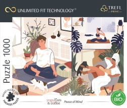 Geniet van rust en ontspanning met de TREFL-puzzel uit de UFT-collectie met een motief van yoga, katten en koffie. Dankzij de Unlimited Fit Technology kun je gemakkelijk meerdere afbeeldingen tot één grote collage combineren. Deze puzzel van 1000 stukjes biedt slimme puzzelvormen, stevig karton voor een lange levensduur en biologische verpakking zonder onnodig plastic.
