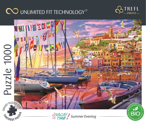 Trefl UFT Vacay Time: zomerse avond, 1000 stukjes. Onbeperkt motieven koppelen, unieke uitsparingen, stevige verbinding en eco-verpakking. Afmeting 68,3 × 48 cm.