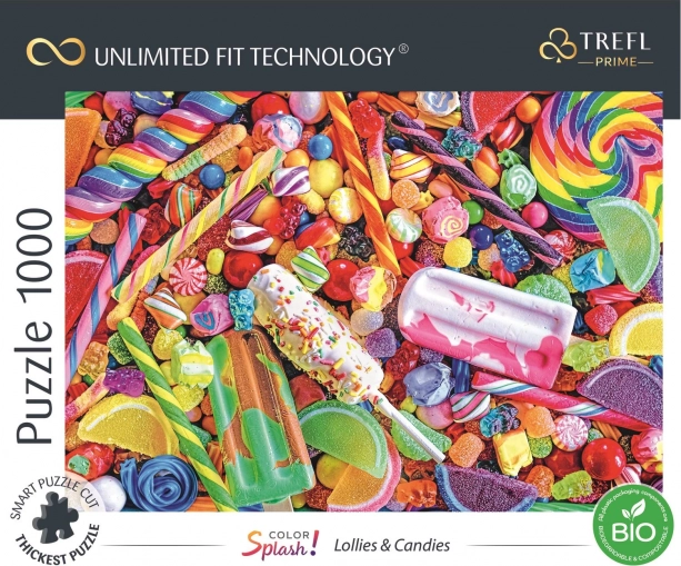 Puzzel TREFL UFT Color Splash 1000 stukjes met motief van lolly’s en snoepjes. Premium karton, unieke vormen, eenvoudig koppelen van motieven en eco-verpakking.