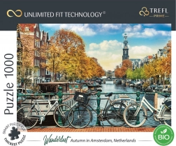 Ontdek creatief puzzelen met Trefl UFT Wanderlust: herfst in Amsterdam. Dankzij de unieke Unlimited Fit Technology verbind je eenvoudig meerdere motieven tot één collage. Je krijgt 1000 stukjes van hoogwaardig blauw karton met unieke vormen die stevig in elkaar blijven. Het ecologische bioverpakking zonder plastic folie is ook goed voor de planeet.