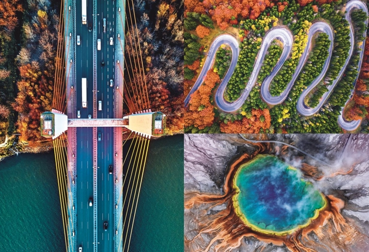 Geniet van fascinerende luchtbeelden van een brug over water, slingerende wegen in een kleurrijk bos en een geothermische bron in levendige kleuren. De serie UFT (Unlimited Fit Technology) maakt het mogelijk om meerdere motieven te leggen en vervolgens te koppelen tot één grote collage – jij bepaalt de grenzen.